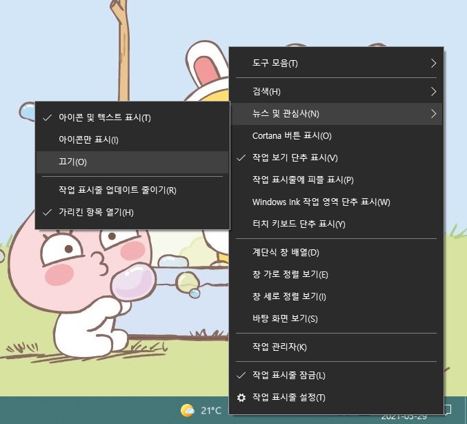 | [윈도우10] 작업표시줄 뉴스 및 관심사(날씨) 언어 변경하기 (0) | 2021.06.15 |