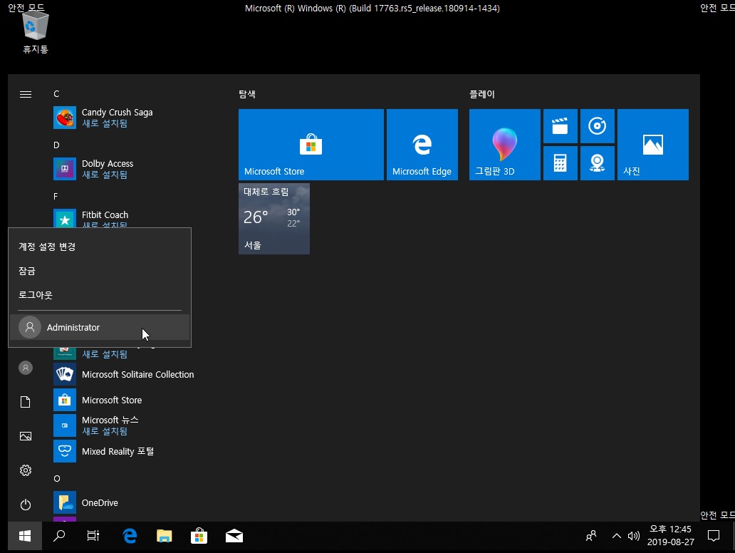 안전모드에 진입하면 시작 - 상단 계정 클릭 - Administrator가 활성화되어있는 것을 볼 수 있습니다. 해당 계정을 클릭하여 로그인합니다.
