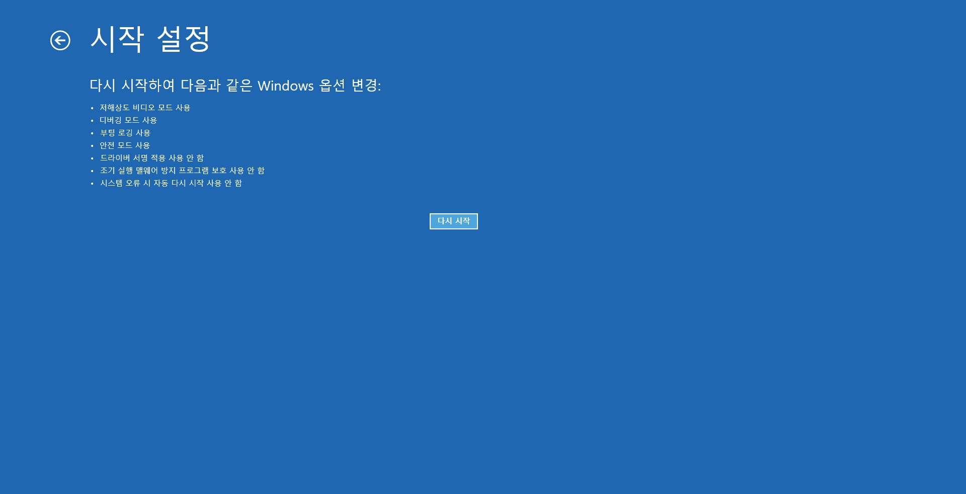 다시 시작을 클릭하여 안전모드에 진입할 준비를 합니다.