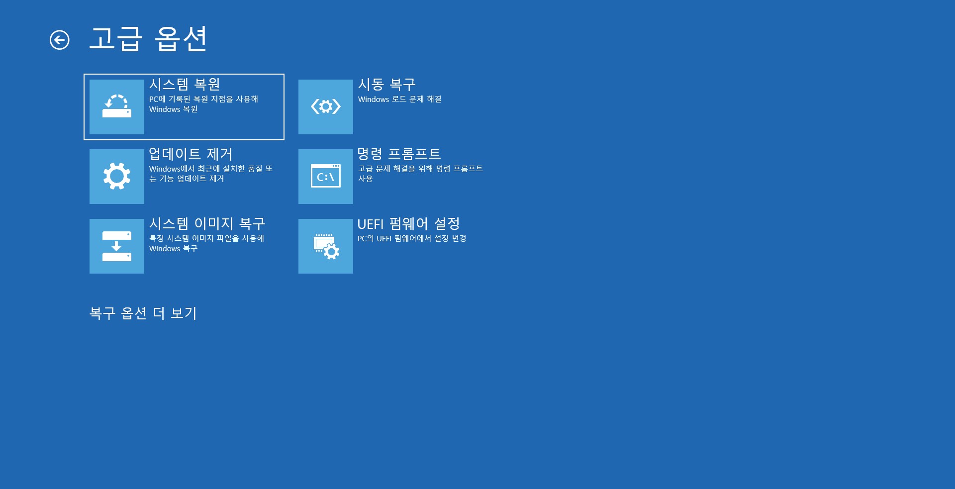 고급 옵션 하단에 복구 옵션 더 보기를 클릭합니다.